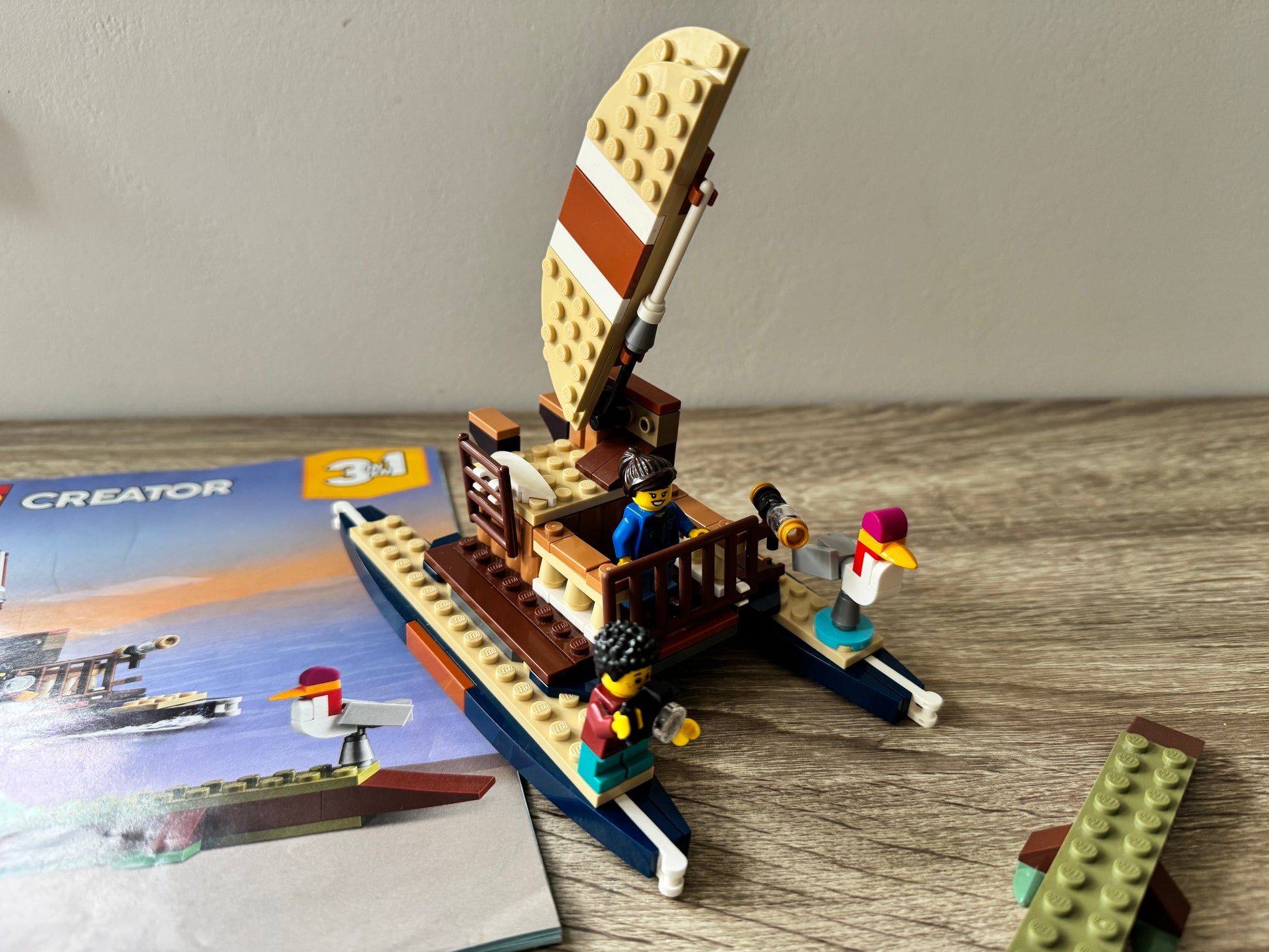Przechodząc do konkretów: to LEGO® 31116 Creator 3w1 – Domek na drzewie na safari z rocznika 2021. Zestaw zawiera 397 elementów oraz 2 minifigurki (chłopiec i dziewczynka – odkrywcy). Egzemplarz jest używany, z oryginalną instrukcją, bez pudełka. Ważna informacja o stanie: brak elementu 6199468 – to czarny ścięty stożek 1½×1½×⅔ (design 33492). Brak nie wpływa na możliwość budowania głównych struktur, ale delikatnie zmienia detal wybranego podzespołu. Model oferuje urokliwy domek na drzewie z balkonem i drabinką oraz zwierzęta do złożenia (żyrafa, flaming i ptak), a w stylu Creator 3w1 z tych samych klocków zbudujesz także dwupłatowiec lub łódź/katamaran, co świetnie wydłuża zabawę i zachęca do kreatywnego eksperymentowania. To znakomity wybór dla miłośników przyrody, fotografii safari i kolekcjonerów, którzy cenią zestawy pełne klimatu i funkcjonalnych, pomysłowych rozwiązań.
