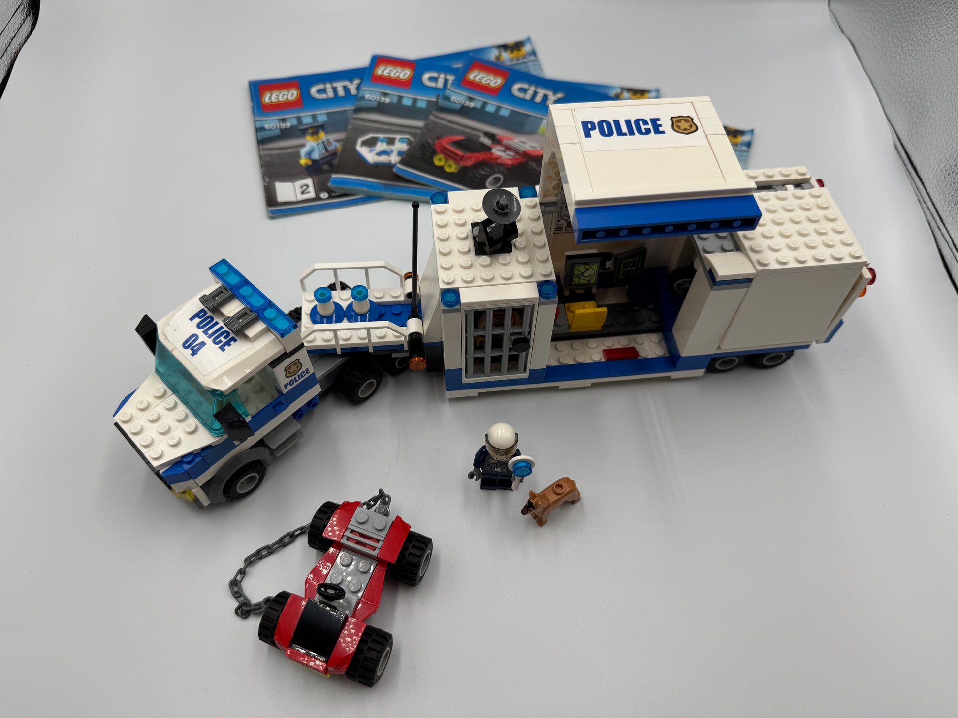 Czas na konkrety: LEGO® City 60139 Mobile Command Center to 374 elementy, 4 minifigurki (2 policjantów i 2 rabusiów) oraz figurka psa policyjnego. Rocznik 2017. Oferowany zestaw jest używany, kompletny, z instrukcją, bez pudełka. Model obejmuje mobilne centrum dowodzenia z odczepianą kabiną, celą z funkcją ucieczki, stanowiskiem monitoringu i miejscem na sprzęt, a także policyjny motocykl oraz quad rabusia z łańcuchem. To esencja dynamicznego budowania i zabawy w policjantów i złodziei: składasz scenę akcji, planujesz pościg, a potem odgrywasz kolejne zwroty akcji. Świetnie wygląda na półce, jeszcze lepiej działa w ruchu – znakomity wybór dla fanów miejskich przygód i realistycznych pojazdów.